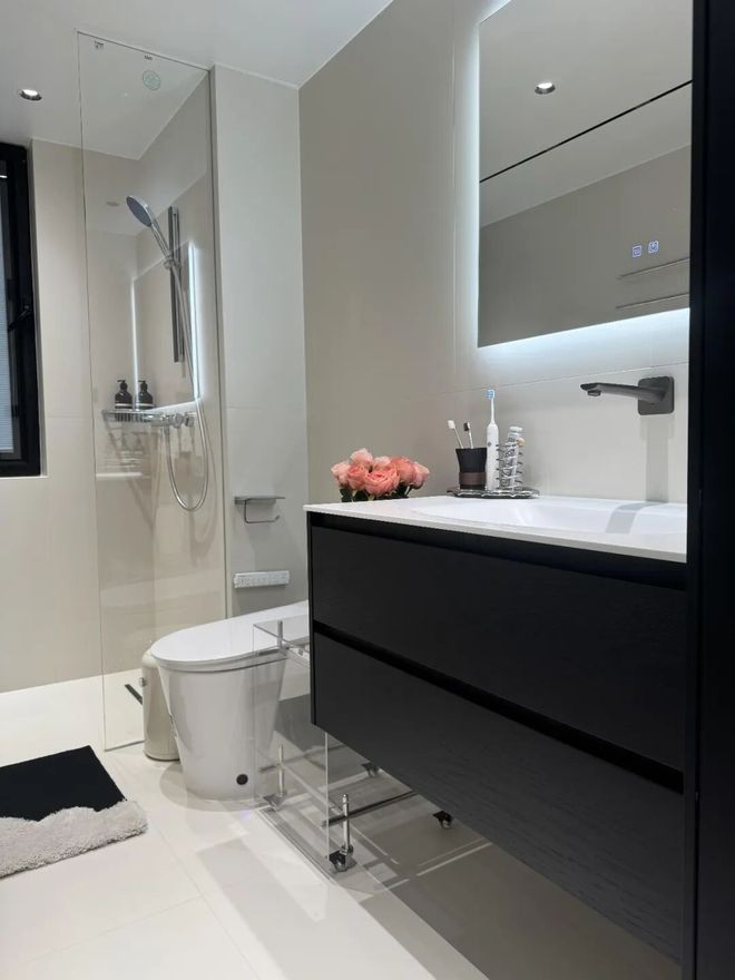 现在的浴室柜基本上都是悬空安装,对于缺少收纳的家庭来说,一定要把悬空空间给利用起来。