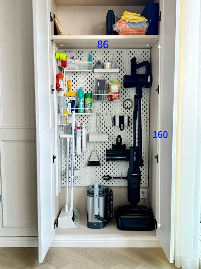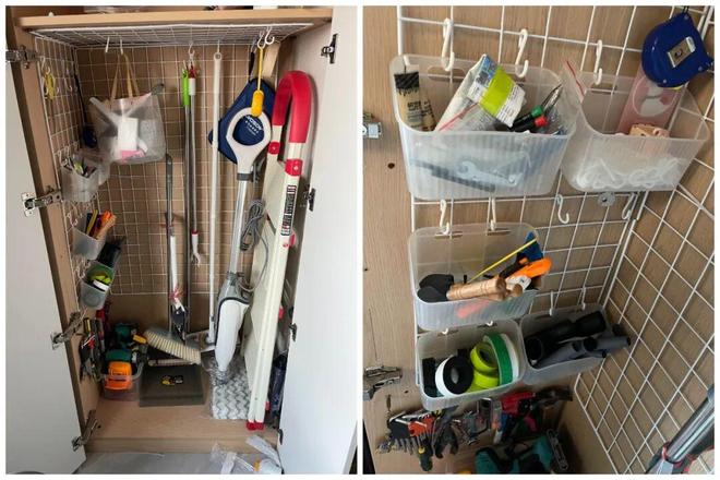 2)家政柜里的小工具太多,给柜子里面安装几块网格片,不管是直接挂起来收纳,还是固定收纳盒,都非常方便,并且关上柜门后,再丑也看不见。