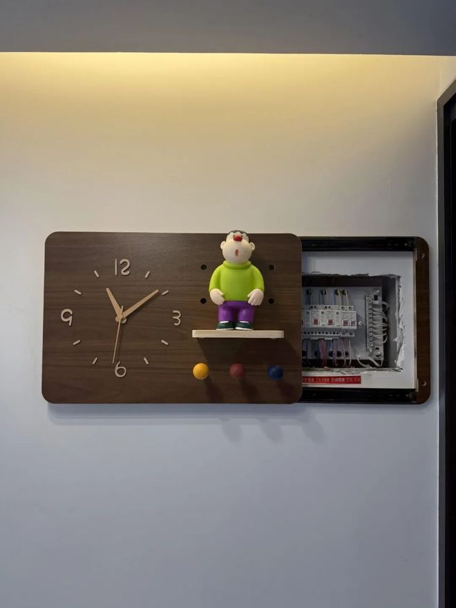 不少家庭都对壁挂钟有一种执念,明明用不上,却还是想挂一个。与其单纯装饰,不如顺手用它遮挡强电箱。