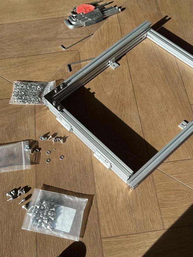 1)根据强电箱尺寸网购8根2020型材,4根做框架,4根做门板,然后自己用角码固定成相框结构。