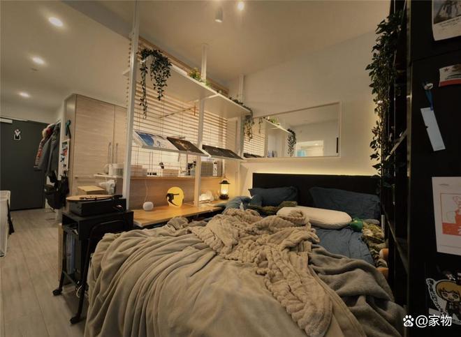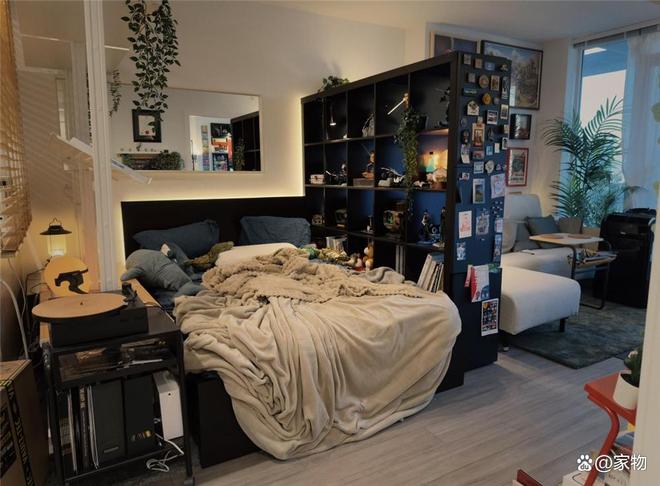 将卧室搬到客厅里,最大的问题就是四周空空荡荡地,睡眠没有安全感,为了解决这个问题,他在厨房一侧用通顶架子搭配百叶窗,将床铺与厨房隔断开,床头的镜子更是增加了一种延伸感,让视觉上空间更显宽敞。
