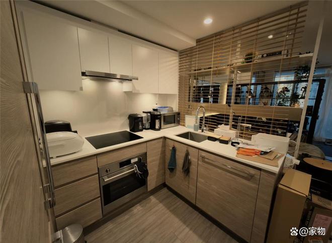 厨房是经典的U形格局开放式厨房,各式厨电一应俱全,灶台也用电磁炉代替,日常做些简单烹饪毫无问题。