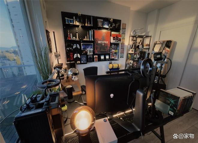 但他还真就这么做了——将床外移到客厅后,卧室内完全空了出来,靠窗位置放书桌,旁边再放收纳架,打造出一个兼顾工作、游戏、展示的电竞房。