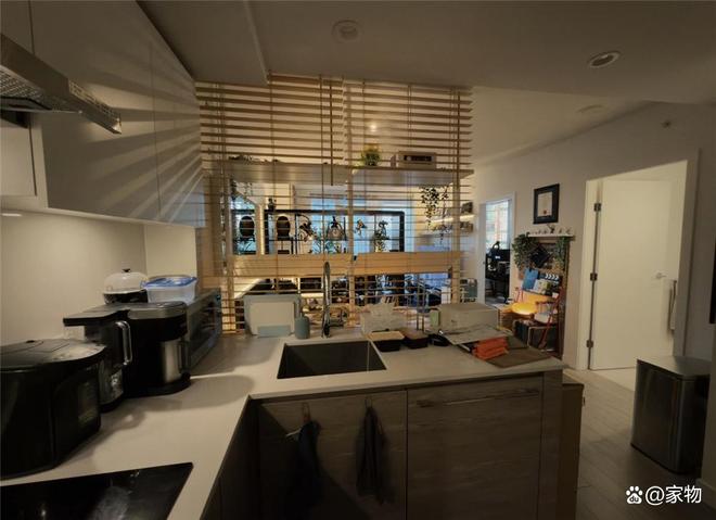 站在厨房里,也能看到刚才说到的百叶窗,完美分隔了厨房和面前的卧室,不会让家居生活区域混淆,也算是低成本改造的典范案例了。