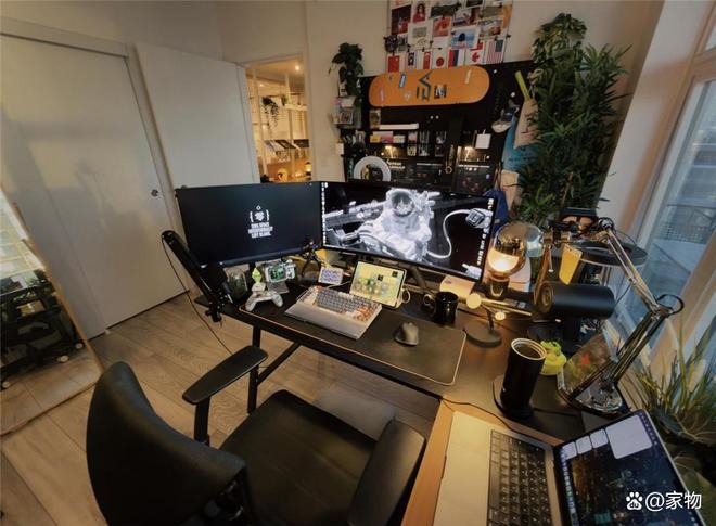 电脑桌设计成半包围式格局,面前屏幕足够大,旁边采光足够强,甚至还有一个放笔记本的地方,无论是办公还是玩游戏,效率都很高。