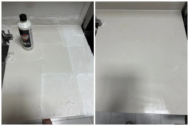 厨房的石英石台面,一旦渗入了污渍,再用普通方法清洁就比较难了。这个时候,可以试试84。