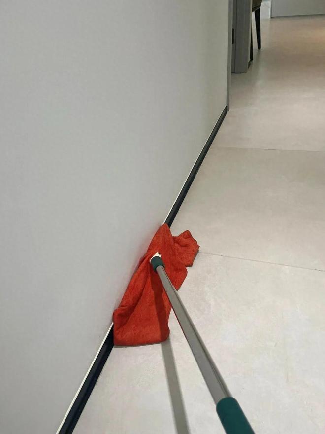 先用吸尘器将踢脚线缝隙里的浮灰吸掉,再用「魔术拖把+抹布」顺着踢脚线一路擦过去就行。