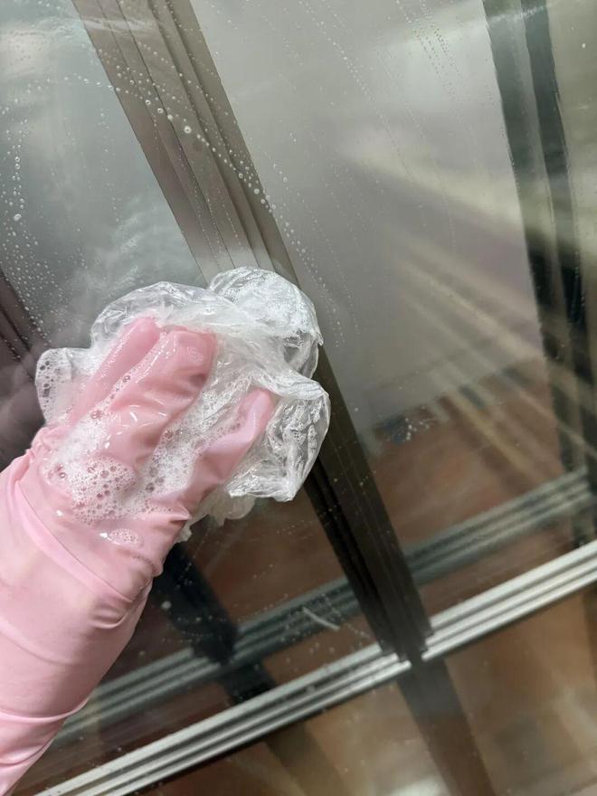 太严重的地方,比如玻璃门,先用「白醋+洗洁精」打圈,静置十几分钟后用塑料袋擦拭。