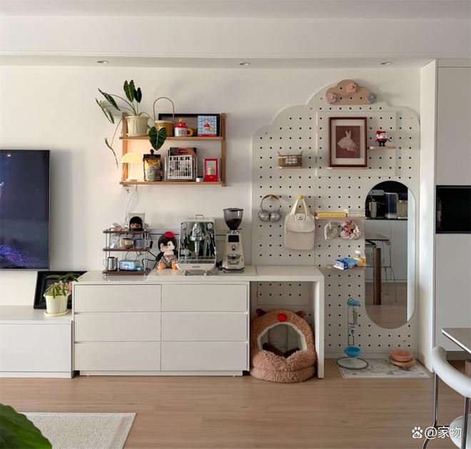 它融合了咖啡水吧和运动空间——柜子上放咖啡机,洞洞板灵活收纳全身镜、耳机等各种物品,且尽量避免太“满”。