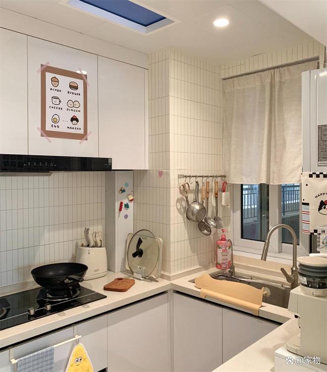 厨房是半开放式格局,窗户正对着外面的连廊,厨房内的格局是“U”字形,灶台、水槽、切菜台分别在三个方向,做饭时只需要一转身就能进行下一步操作,真的特别方便。