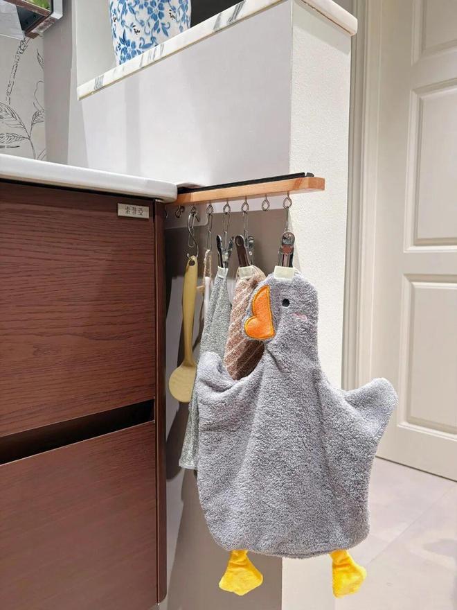 正好还需要一块挂衣服的空间,索性就在门后的柜体上装了个不锈钢长拉手,再搭配几个挂钩夹子,完美。