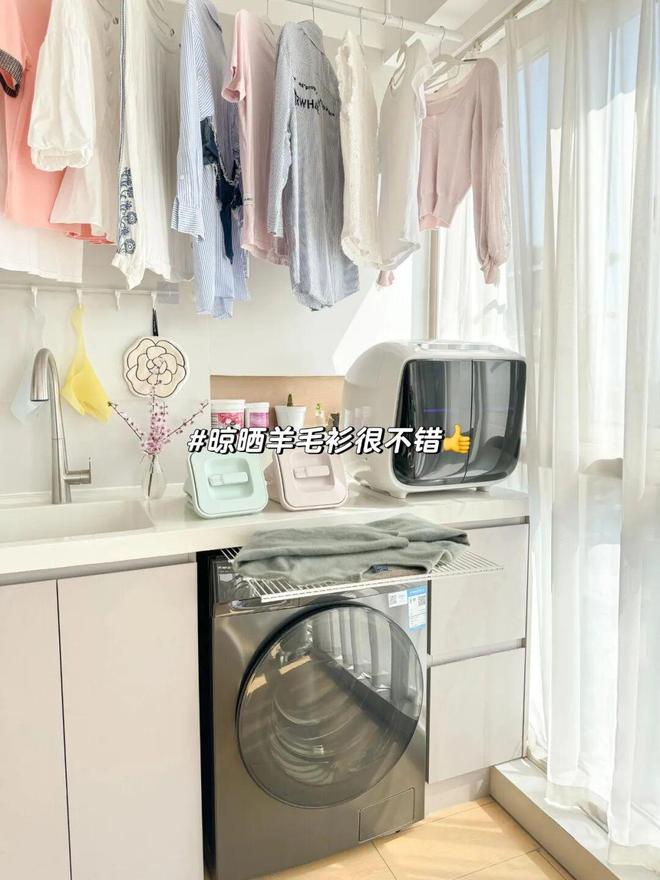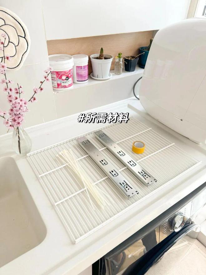 网友@米多多:洗衣机上面3cm空间千万别浪费,把它改造成一个抽拉晒架,不管是用来晒袜子,还是羊毛衫都很方便。