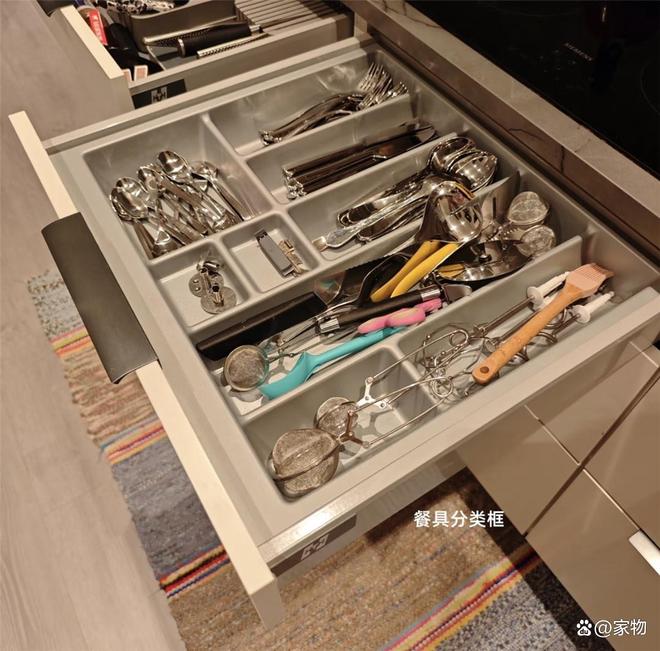 哦对,还有这橱柜的第一层小抽屉,虽然很薄,但完全可以做成专门收纳餐具的抽屉,里面直接做分类格,有大有小,分别收纳勺叉刀筷(好像没筷子)等各种餐具,无论是拿取还是放入其中都一目了然。