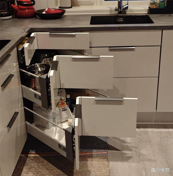看到这种L形橱柜,最为头疼的就是转角的位置,这些地方往往太容易浪费,即便是塞满东西,到最后也是个拿取不便,放在里面的东西要么过期要么遗忘,没法真正应用起来,实在是有些浪费。