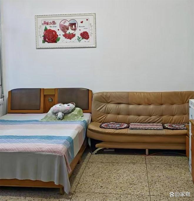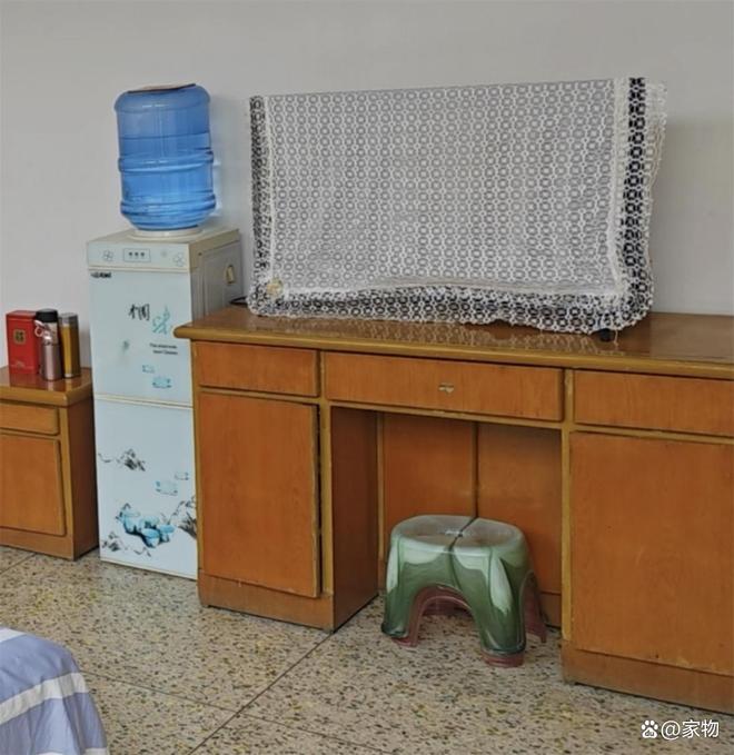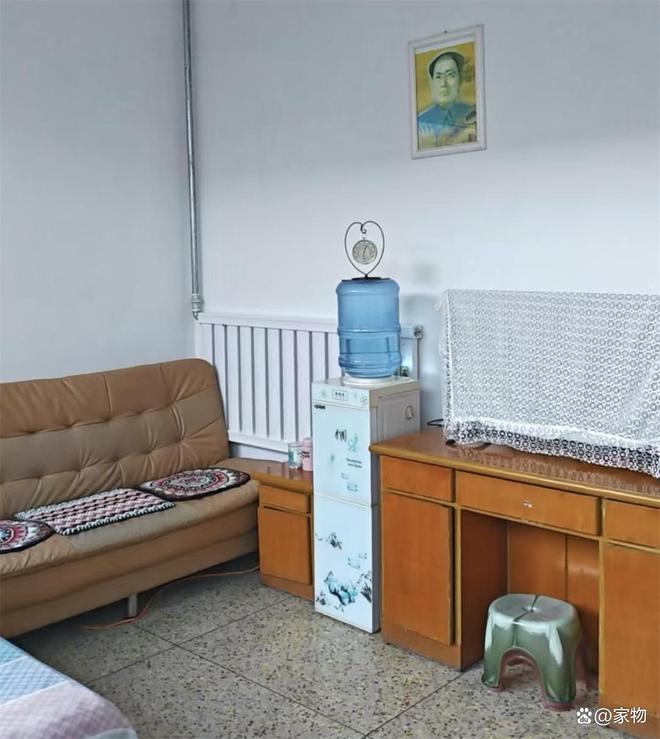 水磨石地面、老旧发黄的家具、普普通通的饮水机,再在床边放上一张长沙发,看起来旧却丝毫不脏。