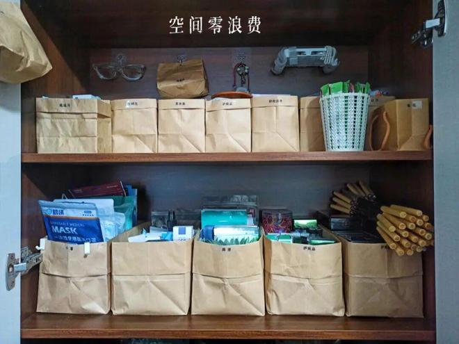 比如柜子或抽屉里的杂物太多,可以把牛皮纸袋简单折一折,分装各种零碎的小物品,立马整齐秩序。