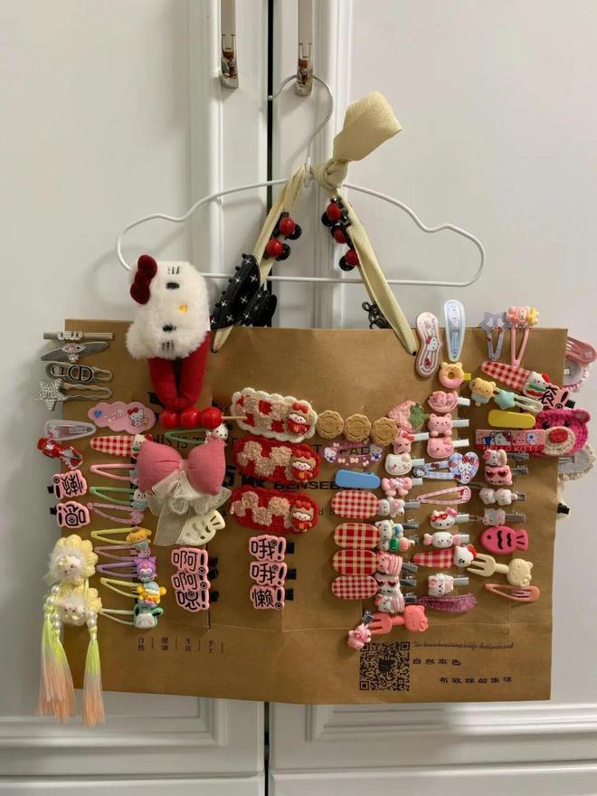 再比如用剪刀在牛皮纸袋中间剪几刀,用来收纳各种发夹和头饰,立马避免了发夹容易丢的问题。