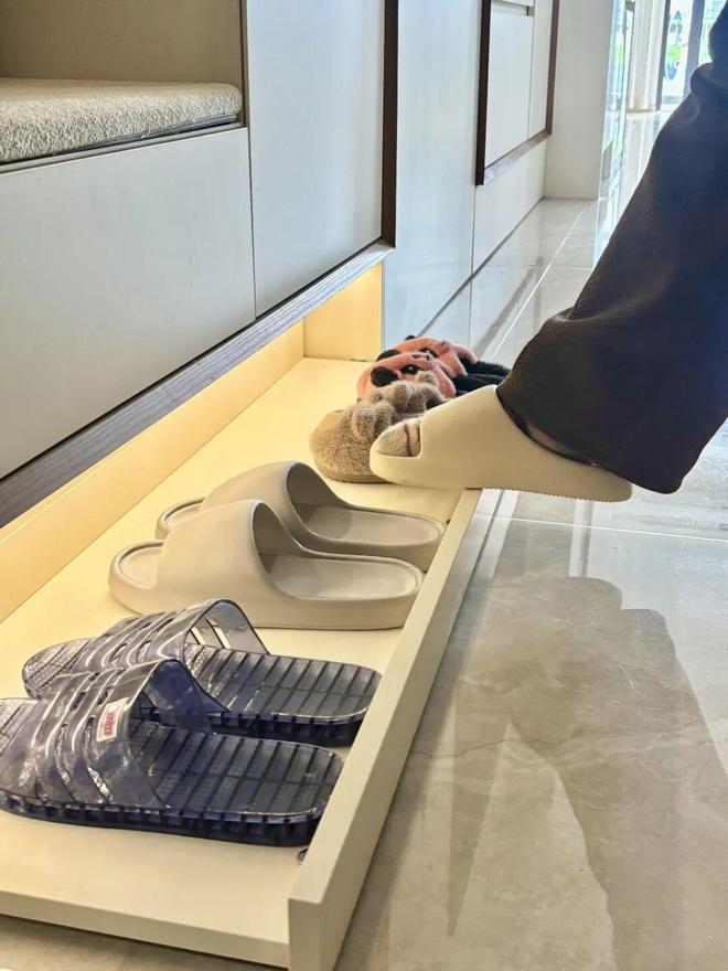 那就在鞋柜底部设计一个「踢脚抽」吧,脚部轻轻一勾,就能把换下来的鞋子摆好,轻松又秩序。