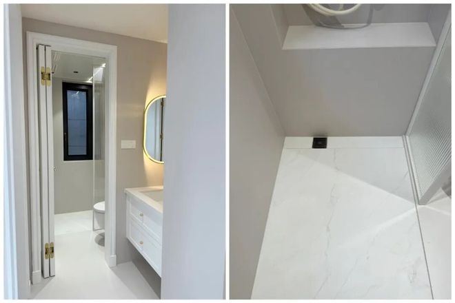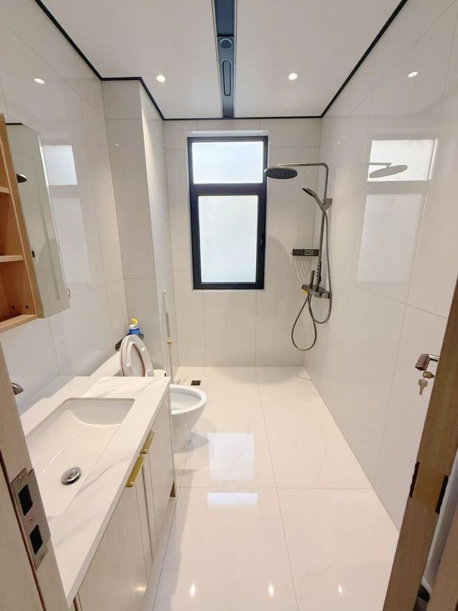 追求颜值的人,可以给淋浴区做下沉2cm处理,再整铺一块大尺寸瓷砖,可以实现无缝一体化效果。