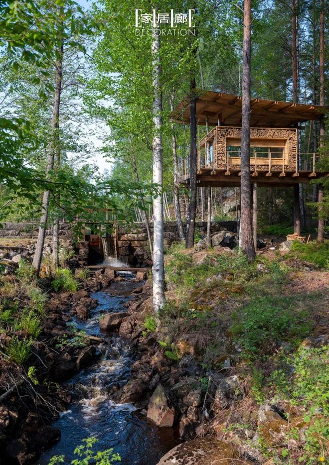 步入室内,旧磨坊的历史痕迹依然被细心保留下来。地下层仍可见缓缓流动的水道与旧涡轮机,一层原有机器成为餐厅中的工业装饰;二层挑高空间开阔明亮,用于舞蹈与健身;顶层则成为冥想与瑜伽室,并可通往屋顶露台眺望森林与湖岸。简洁的木材与裸露结构让光线在空间中自由流动,林间还建有一座树间桑拿房。百年磨坊在新的生活方式中被重新唤醒,成为一处融合建筑、自然与身心疗愈的宁静栖居。