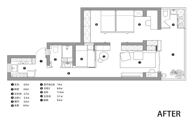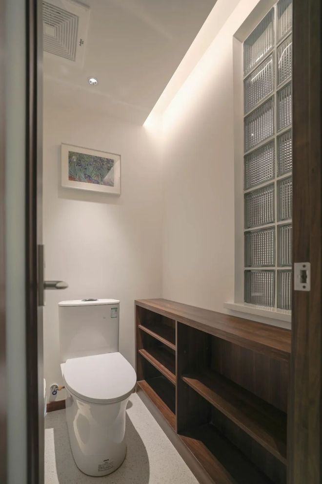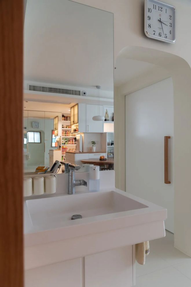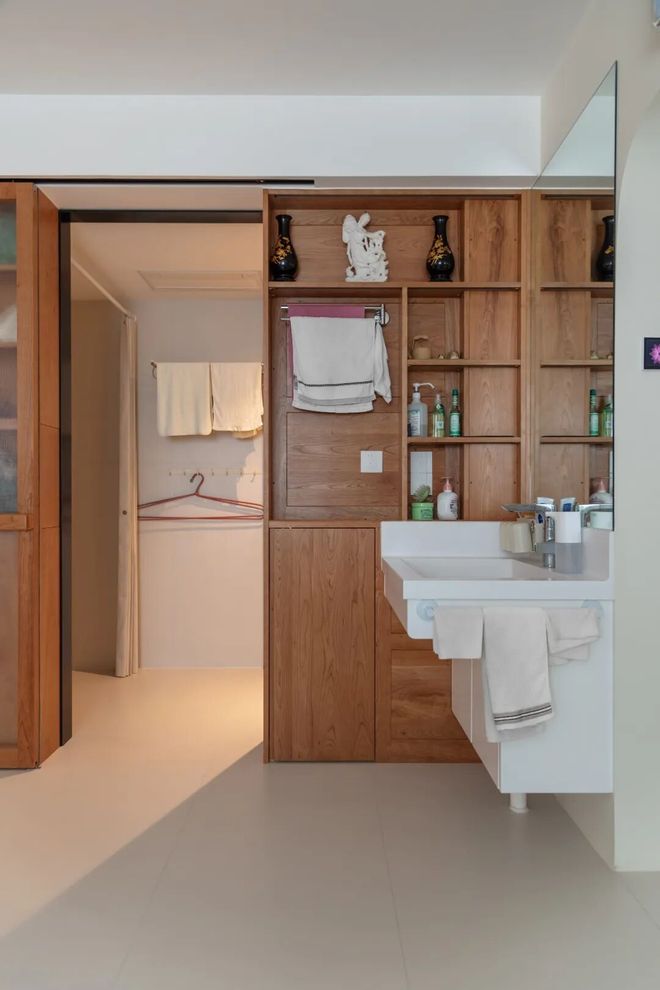 洗漱台使用频率最高,单独外移到过道,不仅好清洁,还避免了早上抢厕所的尴尬。老人家起夜后洗漱也更方便。
