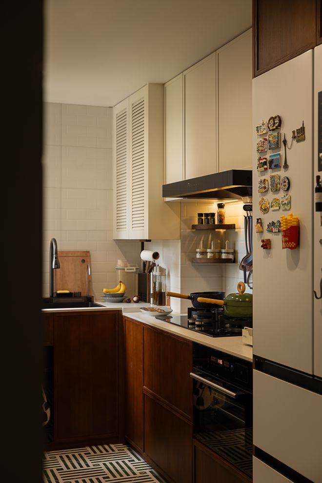 地柜选柚木、胡桃木这些深色系,吊柜就用奶白、灰色这些浅色。一个小提醒:色调要统一,上暖下也暖,别冷暖混搭,不然看着别扭。
