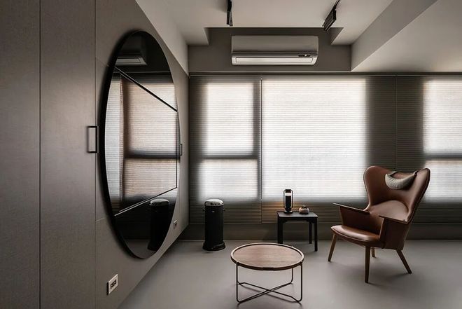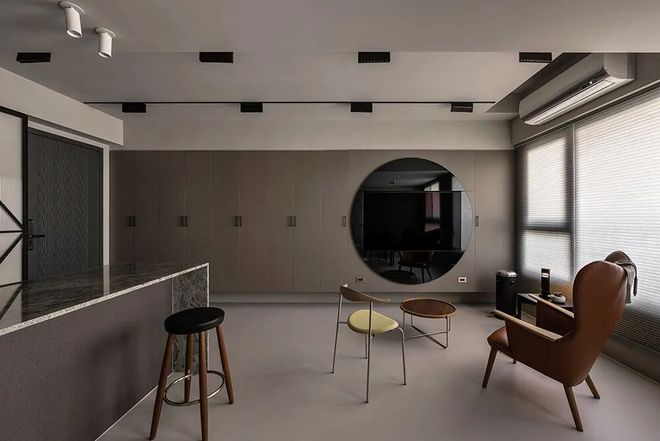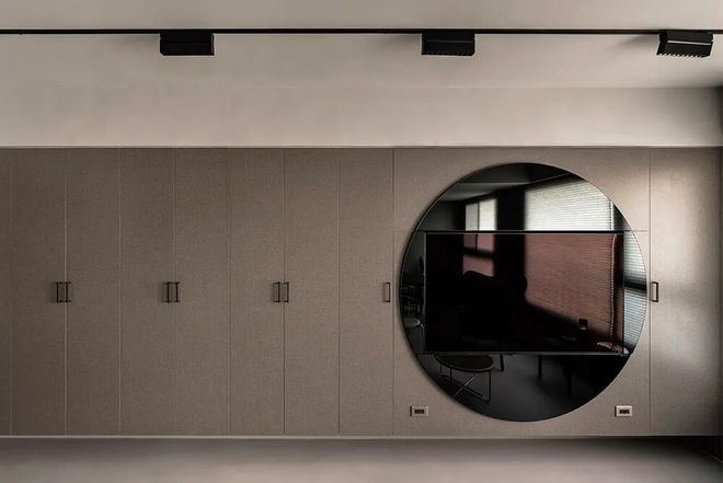 除了篮球,两人共同倾心的Mini Countryman,也成了全屋设计的隐形线索,每一处都藏着懂的人才懂的默契:电视主墙摒弃常规方框,复刻Mini仪表盘造型,整面带状背景+标志性圆形元素,高级又有辨识度