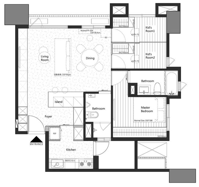 餐厨设计:中岛落置在大门一侧,特意微幅退缩了尺度,使廊面保有余裕之外,中岛采用天然大理石材质,并且选用相似于休旅车的灰绿色,使设计元素互为贯穿,让家景回应生命故事,得以愈形完整。