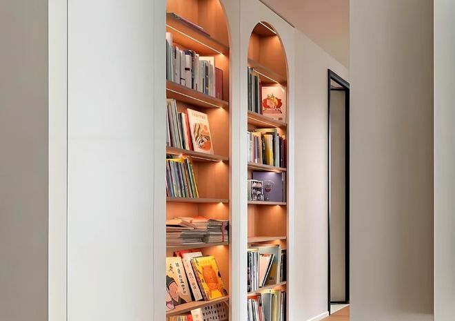 这个深度看似不深,却非常适合作为家庭的书柜,展示柜,或者是杂物收纳柜,完美解决了过道狭长空间浪费的问题,让家多出一间藏书阁。