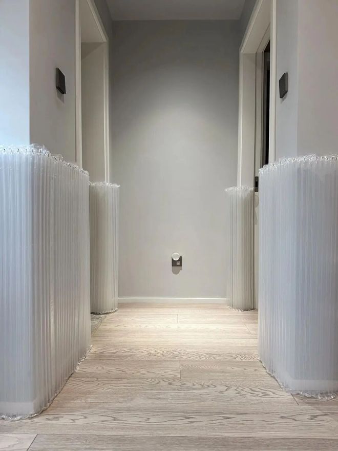 索性网购气泡柱把茶几、电视柜、墙面全都包起来,这样就不用担心被磕碰到了,而且成本只要几十块,非常划算。