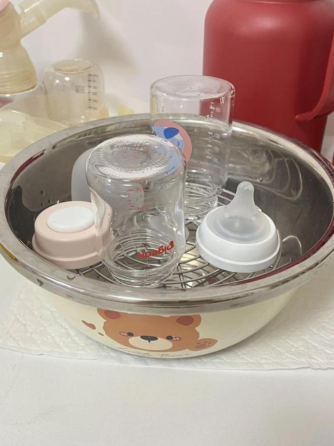 每次用不锈钢盆清洗完奶瓶后,只需要在里面放一个不锈钢蒸架,再把奶瓶倒扣在蒸架上,就是一个超好用的沥水架了。