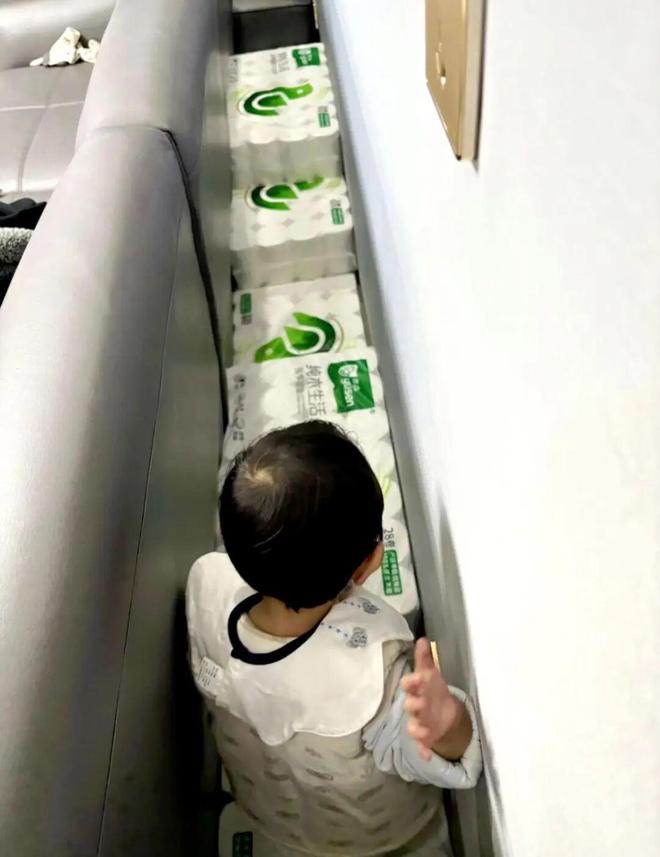 后来直接从超市买了9提10斤的卫生纸,然后在沙发后面搭了一个长过道,立马就成了一个简易攀爬架,娃可喜欢了。