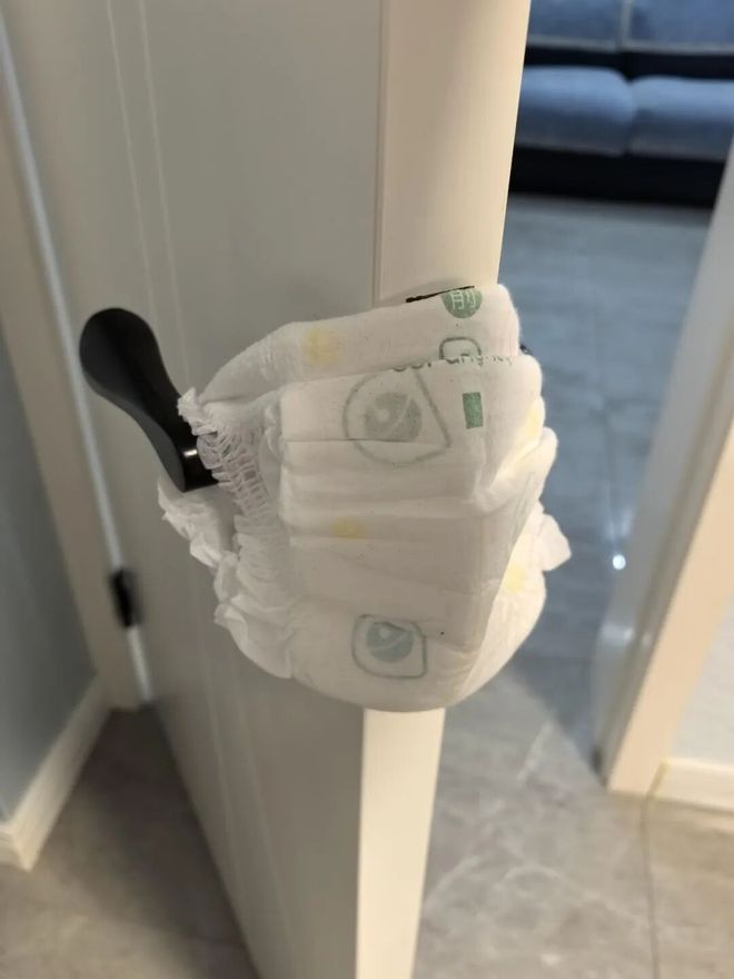 像木门的话,我们可以找个纸尿裤或者娃娃,然后固定在门把手上,就变成一个“防夹手神器”了。