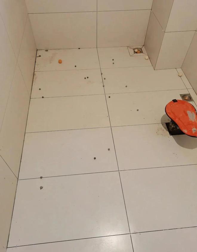 如果说,你想测试地面坡度有没有做好,师傅说地面还没干,不能用水的话,也不用担心,因为可以拿几个弹珠检测一下,弹珠有没有都滚动到地漏的位置,很简单的事,以后房子住十几年都安心。