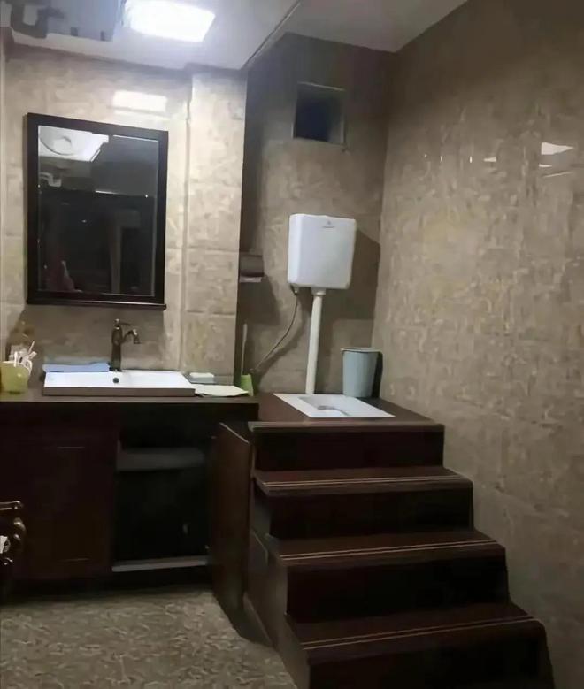还有更离谱的,像这个卫生间,虽然看着简单点,但仍然有像上朝一样,用上卫生间,还得走这么多的台阶。