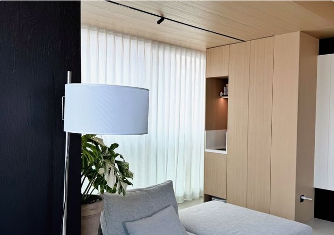 如果飘窗比较长,中间可以设计一个可以升降的小桌台,满足喝茶、办公等需求。