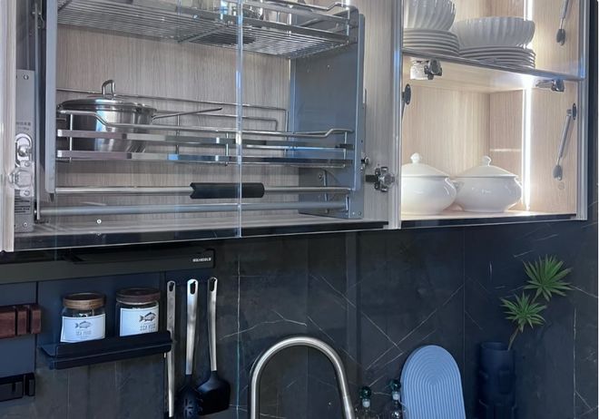 做法也其实很简单。我们在定制啊厨房柜子的时候,把水槽区域和灶台区域做成8~10厘米的高度差,就出现了高低台。