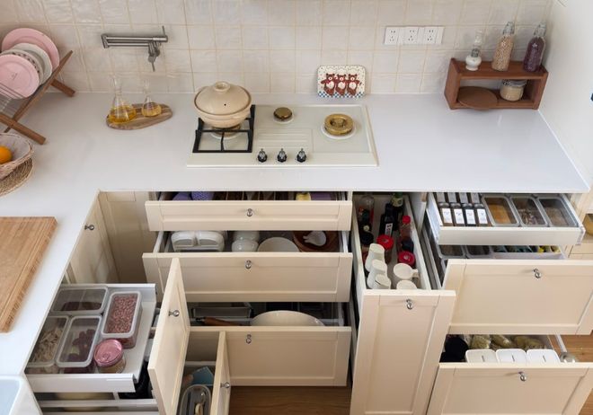 同时还要注意一点,就是地柜尽量多设计成抽屉式,而不是隔板式,而且可以预留专门的小厨电抽拉层板或者是锅具的深抽,打造出专属抽屉。