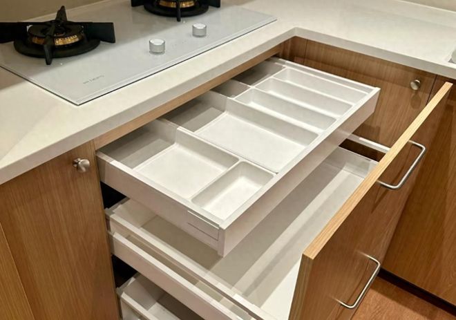 装修建议:厨房橱柜的抽屉的五金是关键,一定要选择可靠的品牌,这也是抽屉寿命的关键。