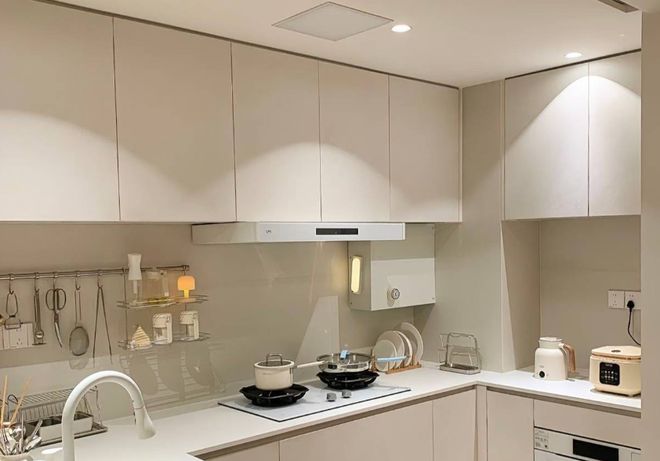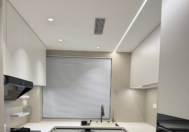装修建议:厨房的灯光系统在水电改造的阶段,要提前布线,比如在吊柜后方可以预留灯线,把所有的照明预留到位。