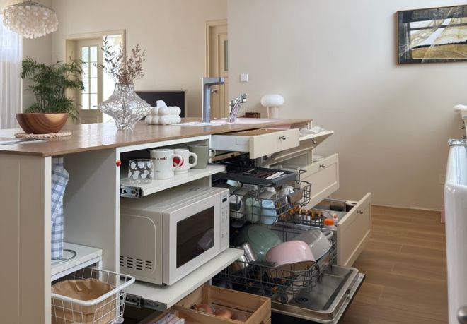 而抽屉式的地柜相对于平开门,取物时不用下蹲,所有的物品也一目了然。专门的小家电的抽屉,用时拉出,不用时推回,能够保持台面无异物,干净又整洁。