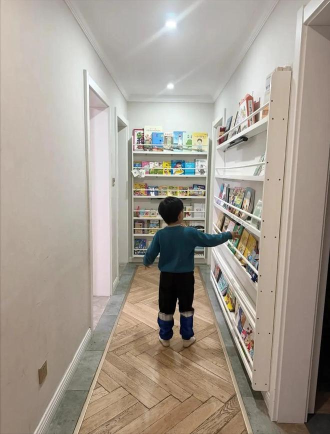 要知道将书柜放在走廊比客厅要好很多,因为客厅来来回回的人多,很容易分散孩子的注意力,而放在走廊,白天一般都不会去“静区”空间。
