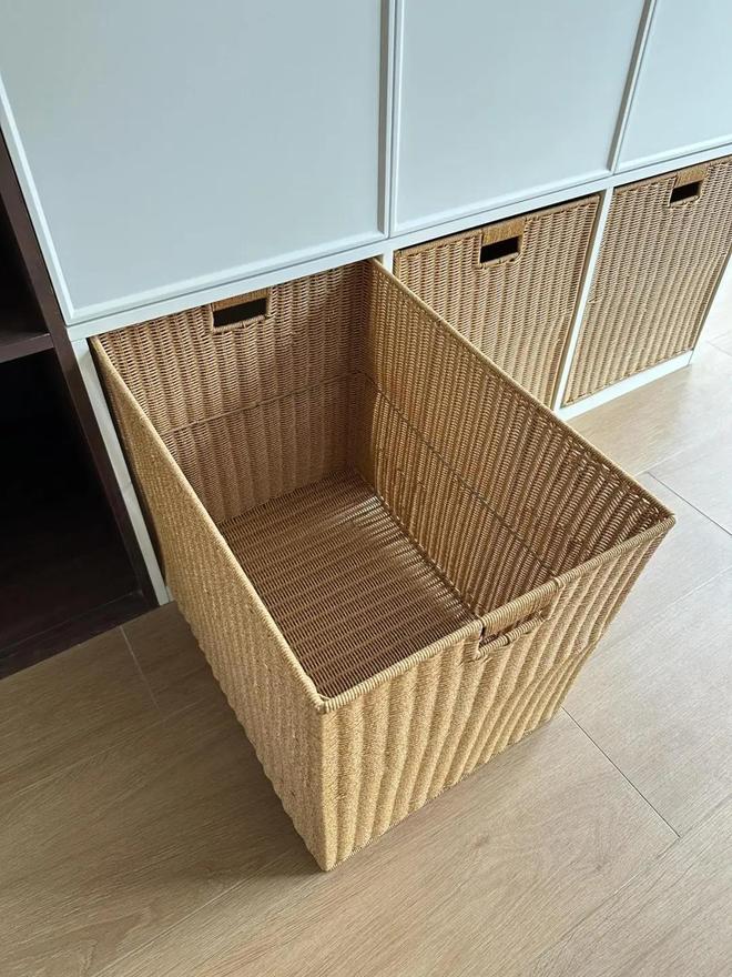 只需要在电视柜下面预留出几个空出来,然后放上编藤篮,就可以将小孩子自己收拾玩具放进去,真是美观又实用!