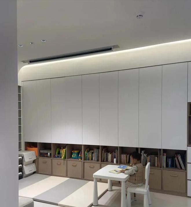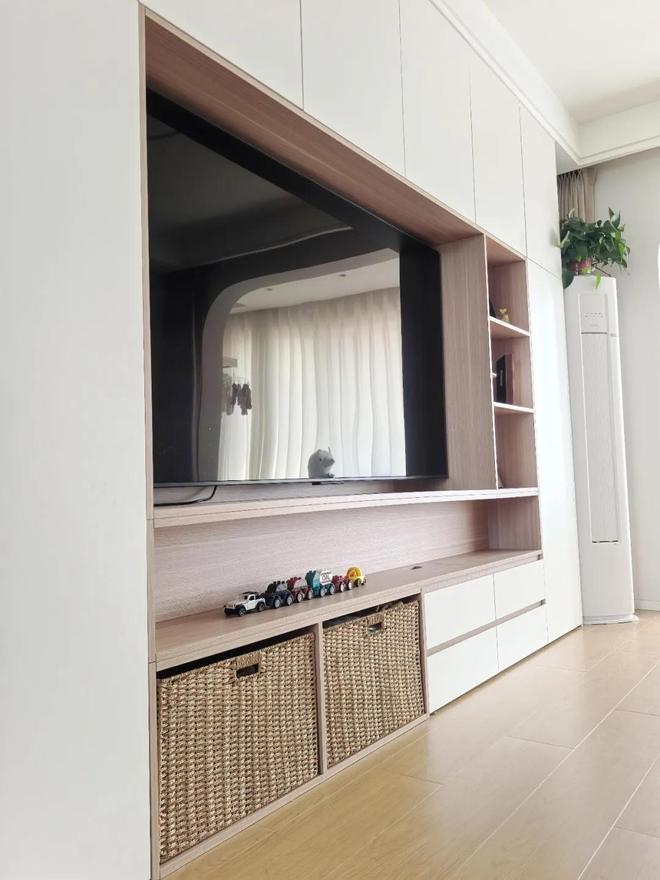 如果说你家有小宝宝,或者是说还打算生二宝的话,客厅电视柜位置预留出玩具收纳区,就是最好的设计。