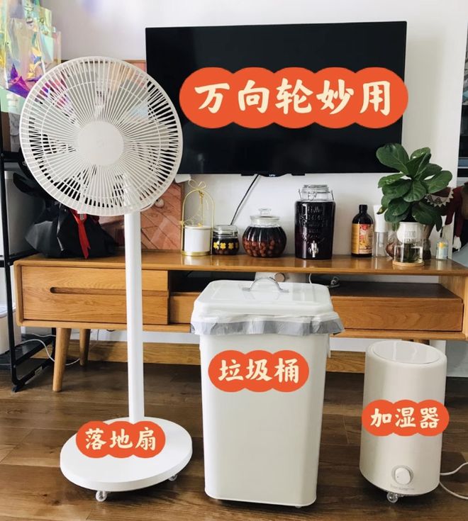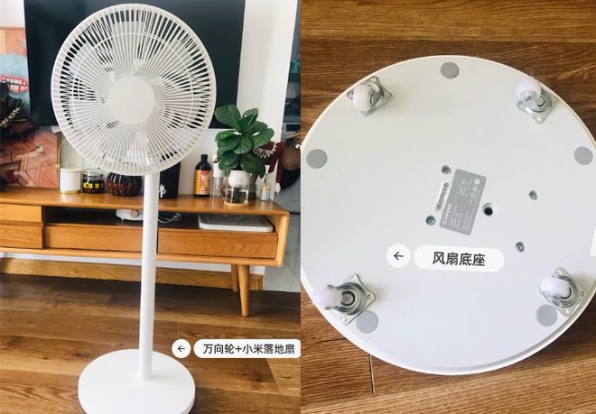 最后就是这电风扇啦,夏天要用的落地扇,底部装万向轮后,也可以在客厅、餐厅、卧室间轻松来回,相比于自己用手拎更省事儿,如果怕不稳当,也可以多装一个,五个万向轮能保证风扇运行时也稳如泰山。