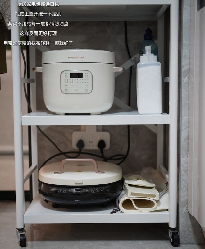 而且对于我家这类小厨房来说,万向轮的存在也方便了我时常改变厨房里的格局,即便增减厨电或者想换个地方放架子也不费事儿,往边上一推就OK。
