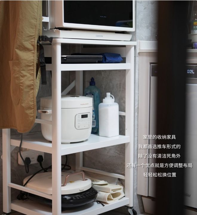 吃放收纳架装上万向轮更加便于挪动,清洁地面角落缝隙的油污尘垢会方便不少,且架子上的厨电和杂物较多,装上轮子也就不用每次打扫时候搬架子了。