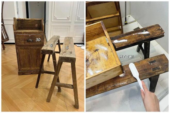 比如网友@UU花40块钱淘来的长凳和柜子,看似普通陈旧,但只要刷洗干净,那种被岁月包裹的质感便能重新显现。
