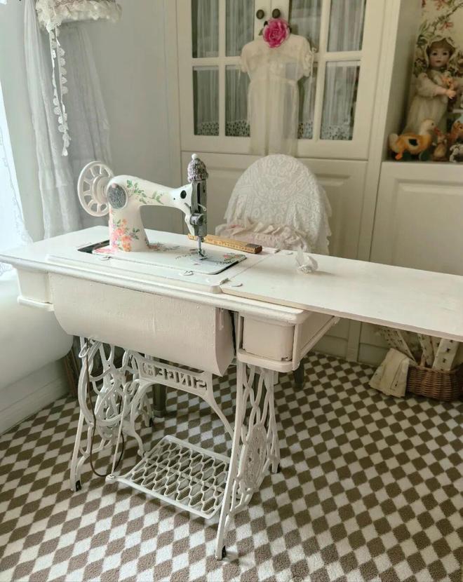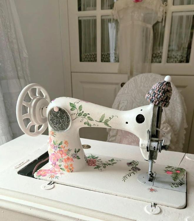 2)给缝纫机重新刷上防锈漆和白色水性漆,再将纸巾上的花剪下来用蝶古巴特胶粘到机头上,立马就有一种高贵典雅的气质。