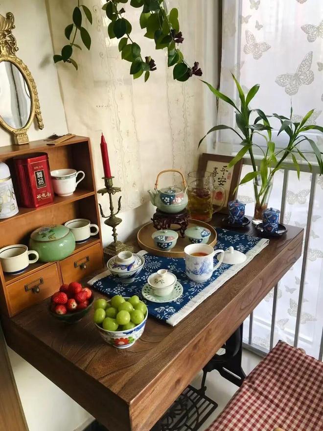 1)定制一张3面或4面下挂的桌板,直接装到缝纫机上,再铺上蜡染茶布和茶具,就是一张茶桌,而且自带古朴气息。